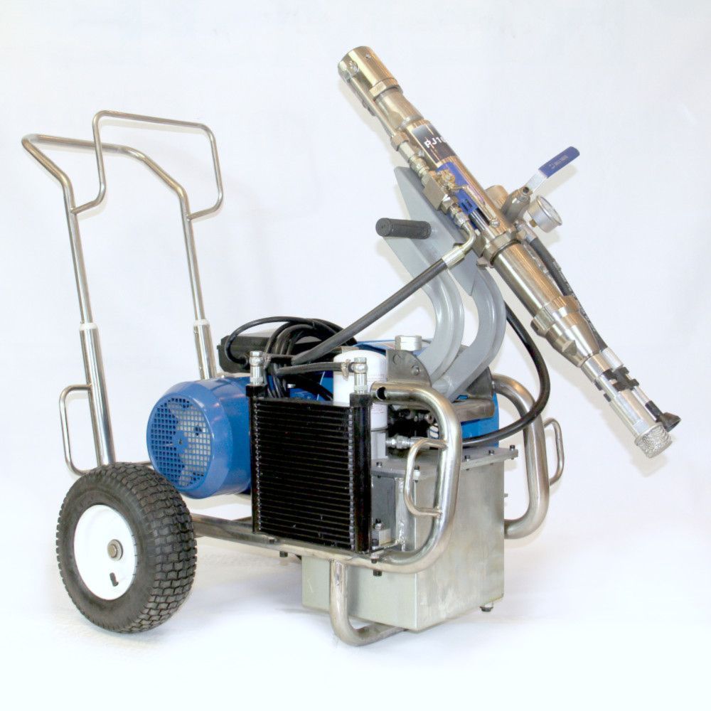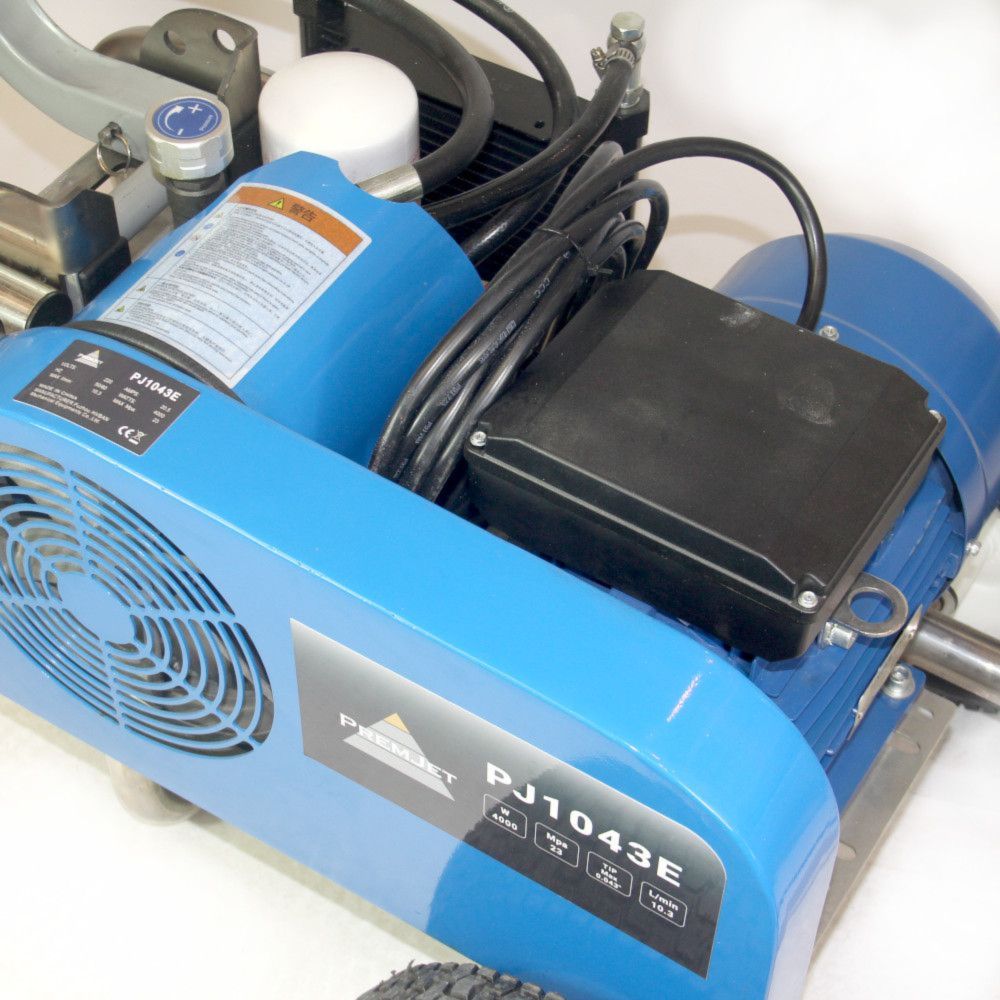 Безвоздушный окрасочный аппарат PremJet PJ 1043E с электрическим приводом и пневматическим насосом предназначен для профессионального применения ЛКМ высокой вязкости с содержанием абразивов для грунтования и окраса больших объёмов в промышленности и на производстве, для нанесения полимерной шпатлёвки, огнезащитных и двух компонентных составов с одновременным применением двух краскораспылителей.
