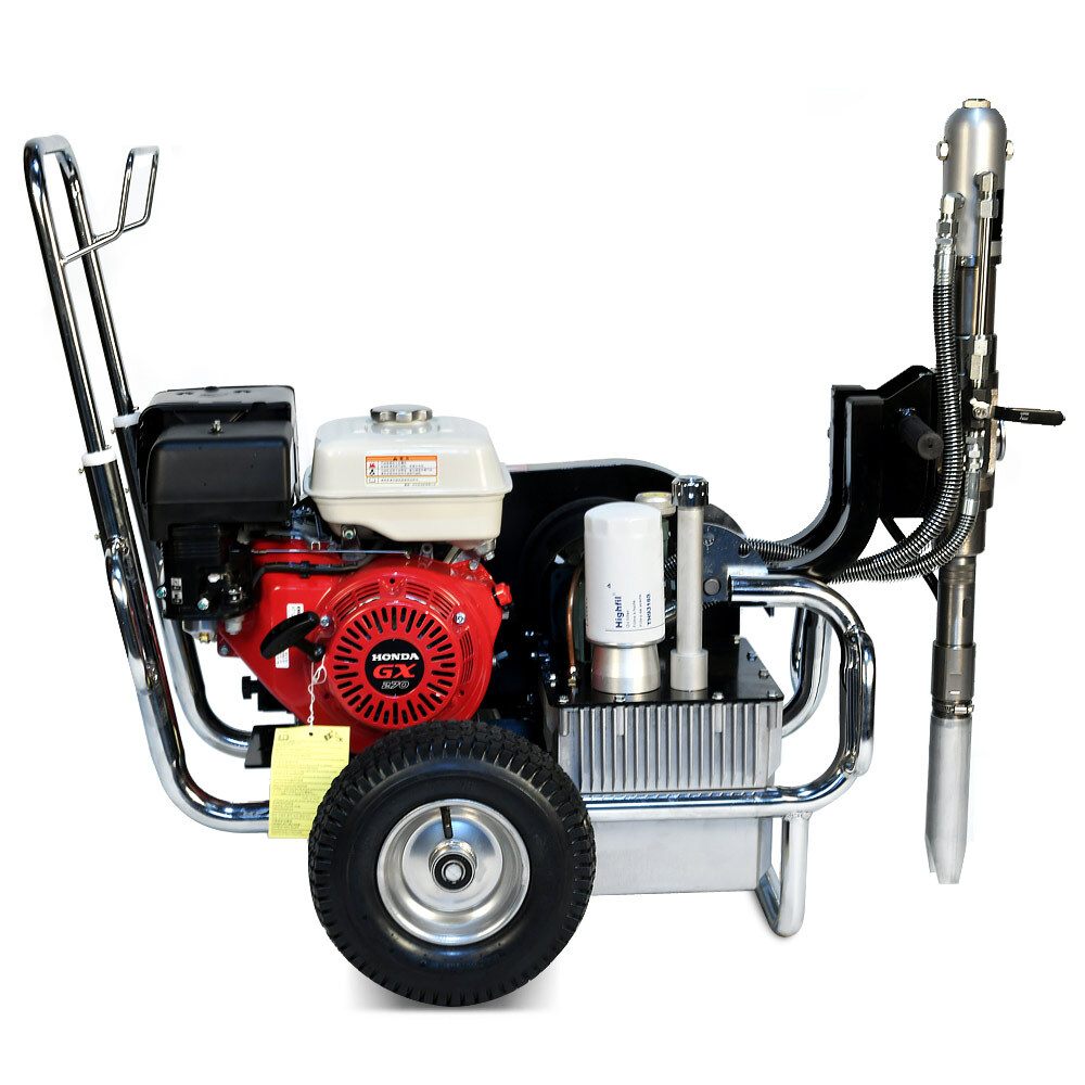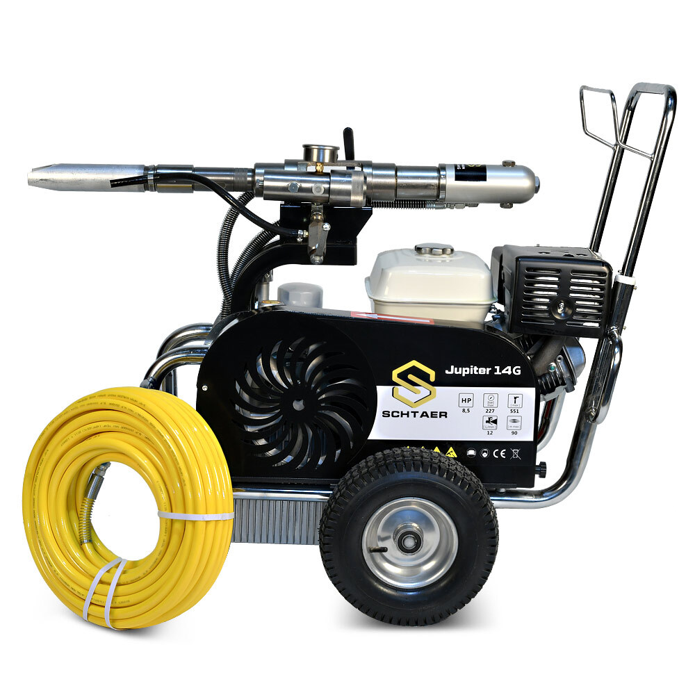 Schtaer Jupiter 14G – это безвоздушный бензиновый окрасочный аппарат, предназначенный для распыления красок с высокой степенью вязкости. Его также используют при работе с огнезащитными составами, гидроизоляционными материалами, антикоррозионными красками, шпатлевками, цинконаполненными материалами, эмалями, мастиками, грунтовками и другими лакокрасочными материалами, предназначенными для нанесения через поршневой безвоздушный окрасочный аппарат. Сферы применения этой модели разнообразны. Ее используют для покраски стен, фасадов и потолков, металлических конструкций, бассейнов, крыш и куполов. Она может применяться при работе с балками, заборами, мостами и тоннелями, изготовленными из металла. Профессиональный аппарат подходит для нанесения дорожной разметки, но при этом потребуется дополнительное оборудование. Модель обладает высокой производительностью (14 л/мин), работает под давлением 230 Бар при мощности 4 000 Вт.